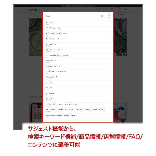 サジェスト機能から、検索キーワード候補/商品情報/店舗情報/FAQ/コンテンツ(EDWIN ONLINE MALL内コンテンツ/特設サイトコンテンツ)に遷移することが可能です。