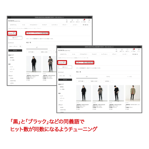 該当する商品の取り扱いがあるが検索キーワードの表記ゆれによって該当商品が0件となってしまうケースなどを、業界知見をもとにした同義語登録により解決し検索精度を向上いたしました。