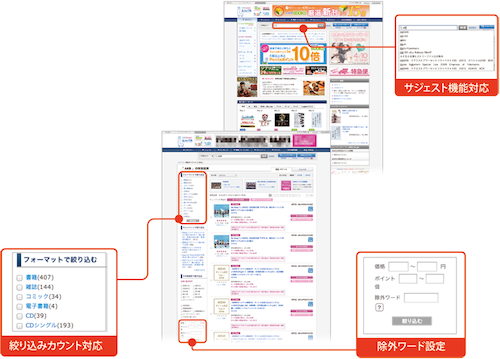 検索キーワード入力補助や、各項目への絞り込み件数表示(ファセットカウント)をすることにより、快適な検索を実現しています。