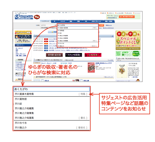 サジェストでは、「芥川賞」など特集ページがあるキーワードが入力された場合に特集ページも候補として表示するなど、ユーザーの回遊率アップに繋がると同時に、サイト内での注目コンテンツをユーザーに知らせる広告としての効果も期待されます。