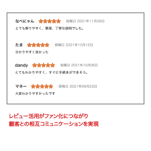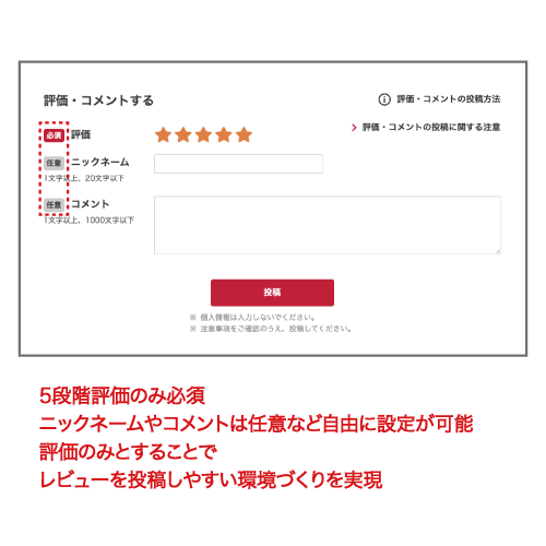 今回の導入では5段階評価のみを必須回答項目とし、ニックネーム/コメントは任意回答とするレビューを実装しており、より気軽にレビュー投稿をしていただくことが可能となっております。