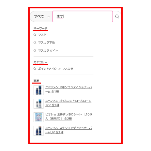 「ZETA SEARCH」の導入により、検索窓で入力中のテキストから連想される『キーワード』『カテゴリー』『商品』をサジェストとして表示する機能を実装いたしました。