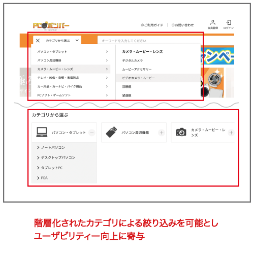 階層化されたカテゴリ一覧から該当の商品分類をクリックするだけで、キーワード入力要らずであらかじめ検索範囲を絞り込むことができ、ユーザーの効率・利便性を高めることが可能です。