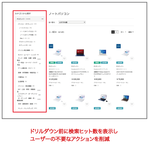 ドリルダウン前に該当商品が何件あるかを数字で表示し、次に絞り込む軸を決める判断材料を提供することで、ユーザーの不要なアクションを減らし最短ルートで目的商品まで導くことができます。