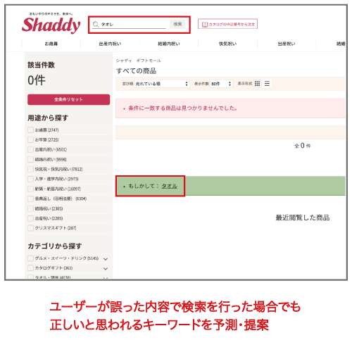 検索時に入力ミスをした場合でも「もしかして」欄に表示されるリンクをクリックするだけで再検索が可能となるよう改善いたしました。