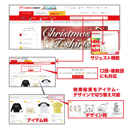 この度の導入では、サジェスト機能・もしかして検索だけでなく、「シュール 動物 シャツ」のような複数ワードや「人の金で焼肉が食べたい Tシャツ」などの口語での検索を可能としたキーワード検索の強化を始めとして、トピック・テイスト・カスタマイズなど様々な項目での絞り込み検索やファセットカウントの実装、おすすめ順・お気に入り順などの並び替えにも対応しています。