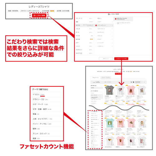 こだわり検索では性別・カテゴリ・カラー・おすすめなどのほかに、イラストレーターやデザイナーなど出店者情報での絞り込みも可能とし、デザインを主軸にした検索を実現したことで、導入後1ヶ月で売上110%を実現しています。