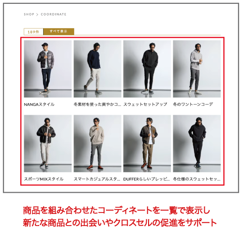 「今着たいカーディガンコーデ」や「今どきのミリタリースタイル」などのテーマに沿ってサイト内の商品を組み合わせたコーディネートの一覧表示が可能となりました。
