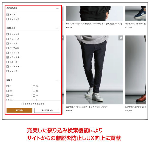 これによりユーザーがスムースに目的の商品に辿り着くことができ、商品がなかなか見つからないことによるサイトからの離脱防止にも繋がります。