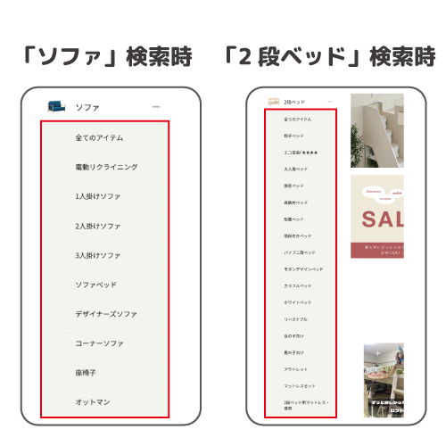 「ソファ」や「2段ベッド」といったカテゴリが細分化され、検索時の絞り込み項目として表示されるようになりました。この機能により、ユーザーが求める商品の特徴(サイズ/素材/使用シーンなど)から直感的に絞り込むことが可能となるため、快適な購買体験の提供に寄与しています。