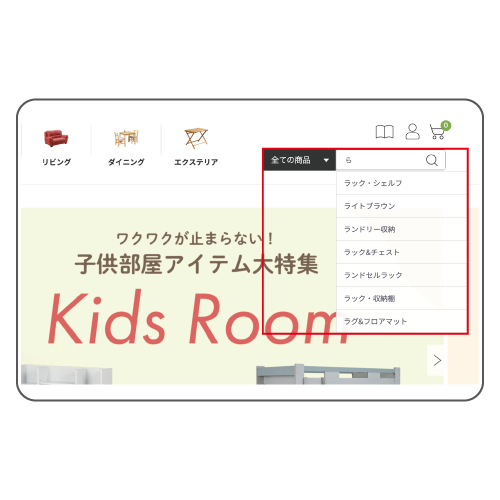 検索窓にて入力中のテキストに基づく予測キーワードがサジェストとして表示されるようになりました。この機能により、すべてのテキストを入力する前に目的のキーワードを選択することが可能となるため、ユーザーの手間を省き利便性向上に貢献しています。