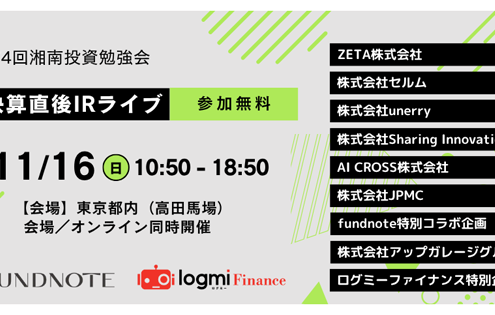 【11/16(日)開催】湘南投資勉強会『新企画決算直後IRライブ』に代表取締役社長の山崎が登壇