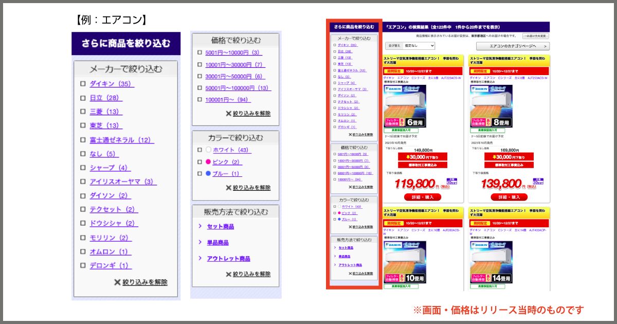 メーカー・価格・カラー・販売⽅法(セット商品/単品商品/アウトレット商品)など詳細な絞り込み項⽬による検索を実装し、ユーザーの利便性向上に貢献しています。